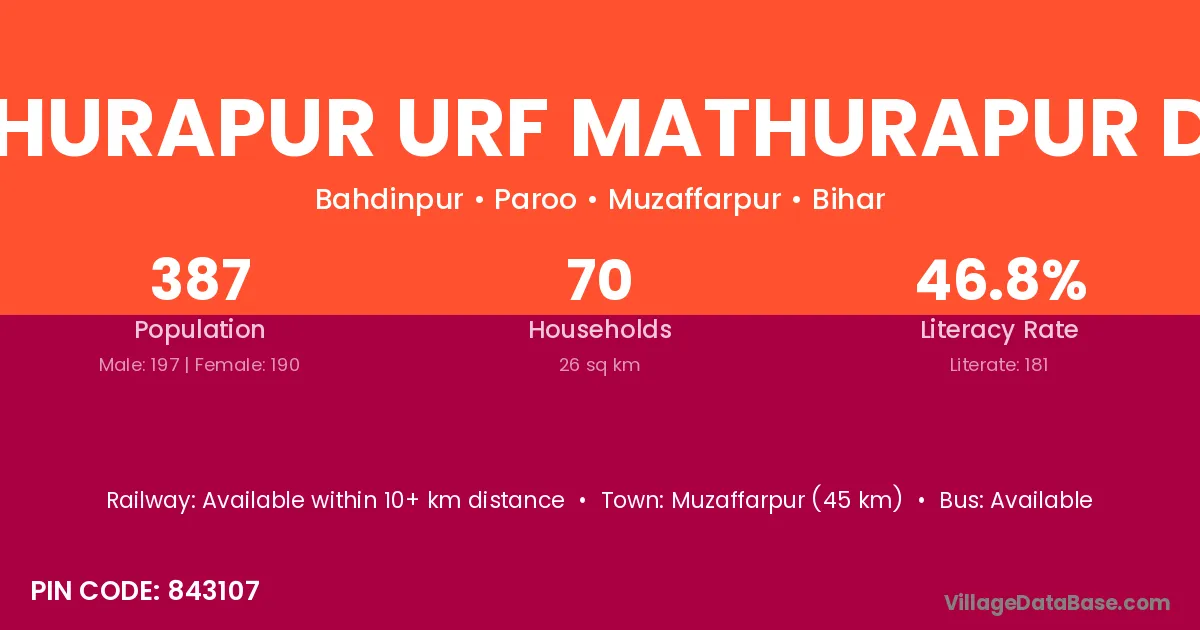 Mathurapur Urf Mathurapur Dakh village has a total population of 387 people, of which 197 are males and 190 are females.