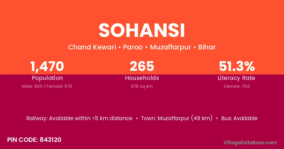 Muzaffarpur (49 km) is the nearest town to Sohansi village for major economic activities and is located approximately 49 km away.