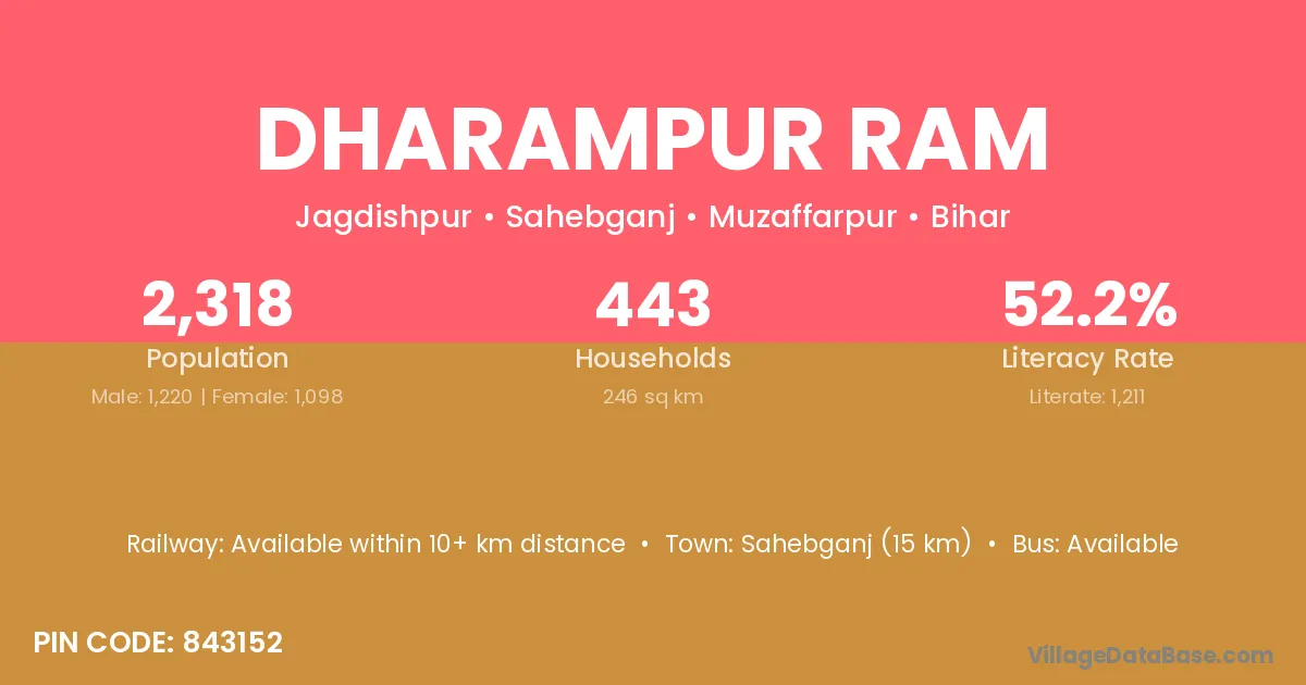 Sahebganj (15 km) is the nearest town to Dharampur Ram village for major economic activities and is located approximately 15 km away.