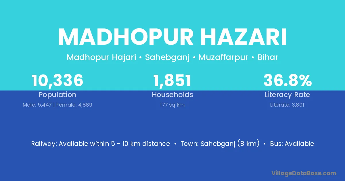 Sahebganj (8 km) is the nearest town to Madhopur Hazari village for major economic activities and is located approximately 8 km away.