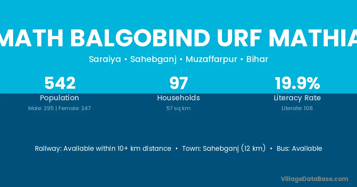 Sahebganj (12 km) is the nearest town to Math Balgobind Urf Mathia village for major economic activities and is located approximately 12 km away.