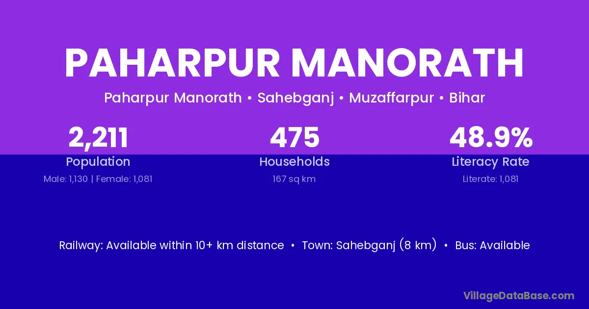 Sahebganj (8 km) is the nearest town to Paharpur Manorath village for major economic activities and is located approximately 8 km away.