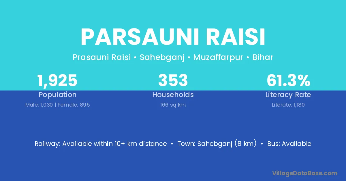 Sahebganj (8 km) is the nearest town to Parsauni Raisi village for major economic activities and is located approximately 8 km away.
