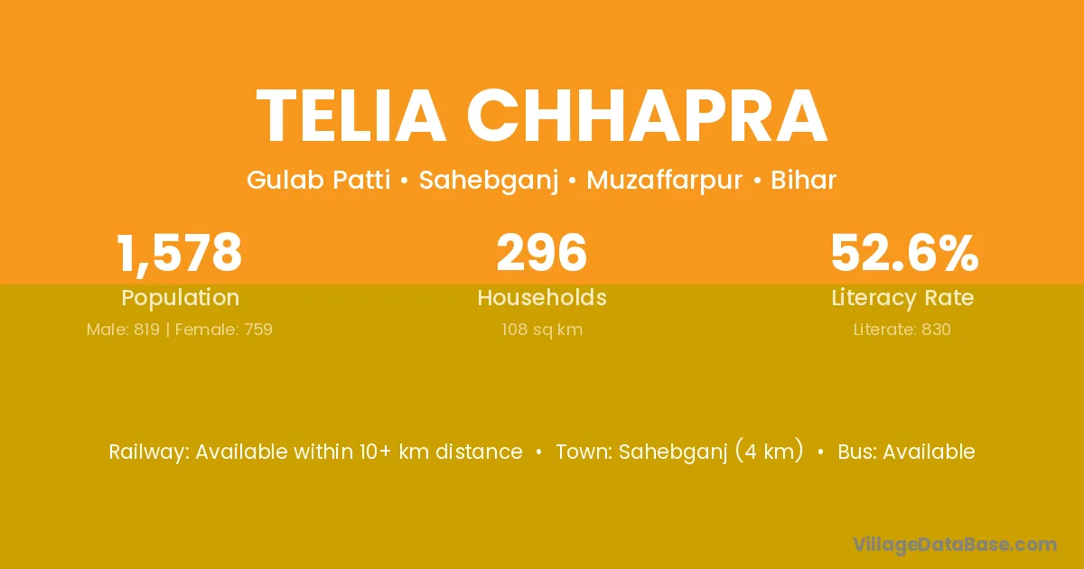 Sahebganj (4 km) is the nearest town to Telia Chhapra village for major economic activities and is located approximately 4 km away.