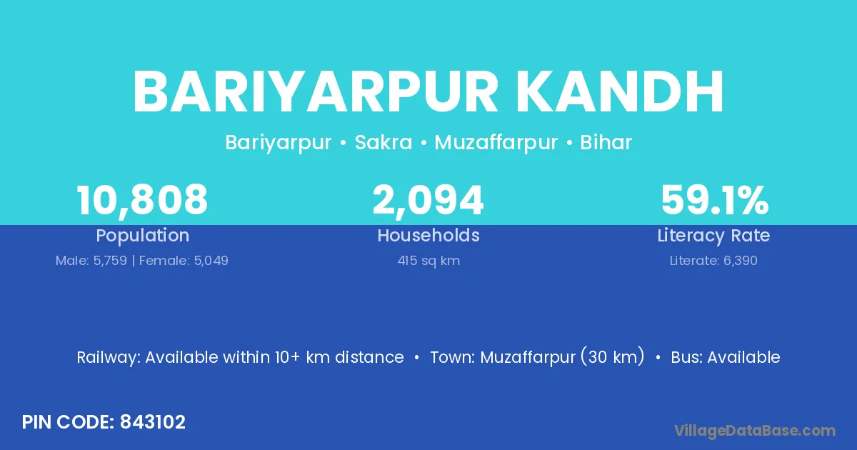 Muzaffarpur (30 km) is the nearest town to Bariyarpur Kandh village for major economic activities and is located approximately 30 km away.
