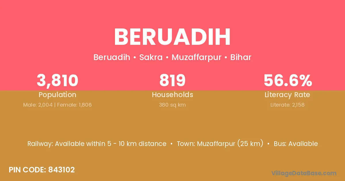 Muzaffarpur (25 km) is the nearest town to Beruadih village for major economic activities and is located approximately 25 km away.