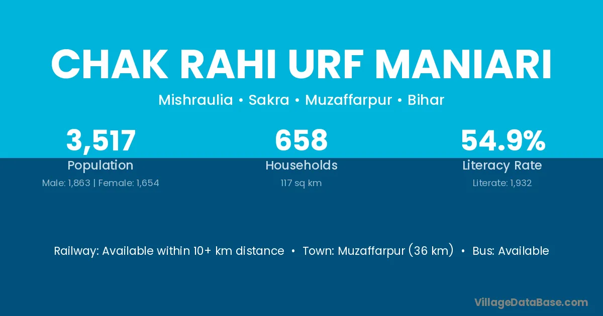 Muzaffarpur (36 km) is the nearest town to Chak Rahi Urf Maniari village for major economic activities and is located approximately 36 km away.