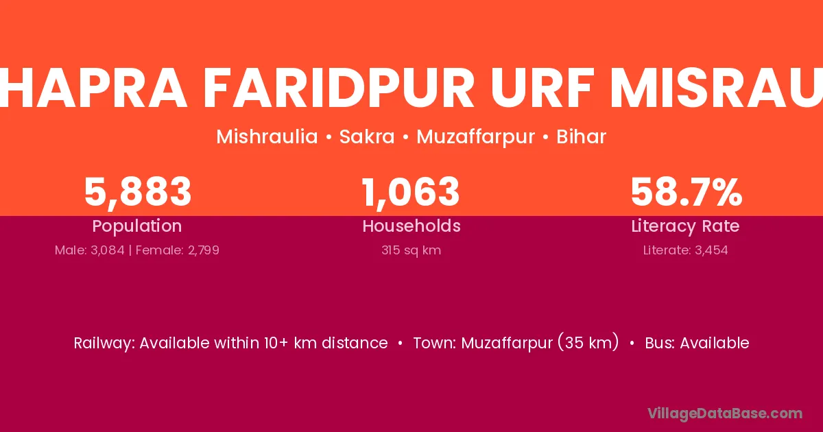 Chhapra Faridpur Urf Misraulia village has a total population of 5,883 people, of which 3,084 are males and 2,799 are females.