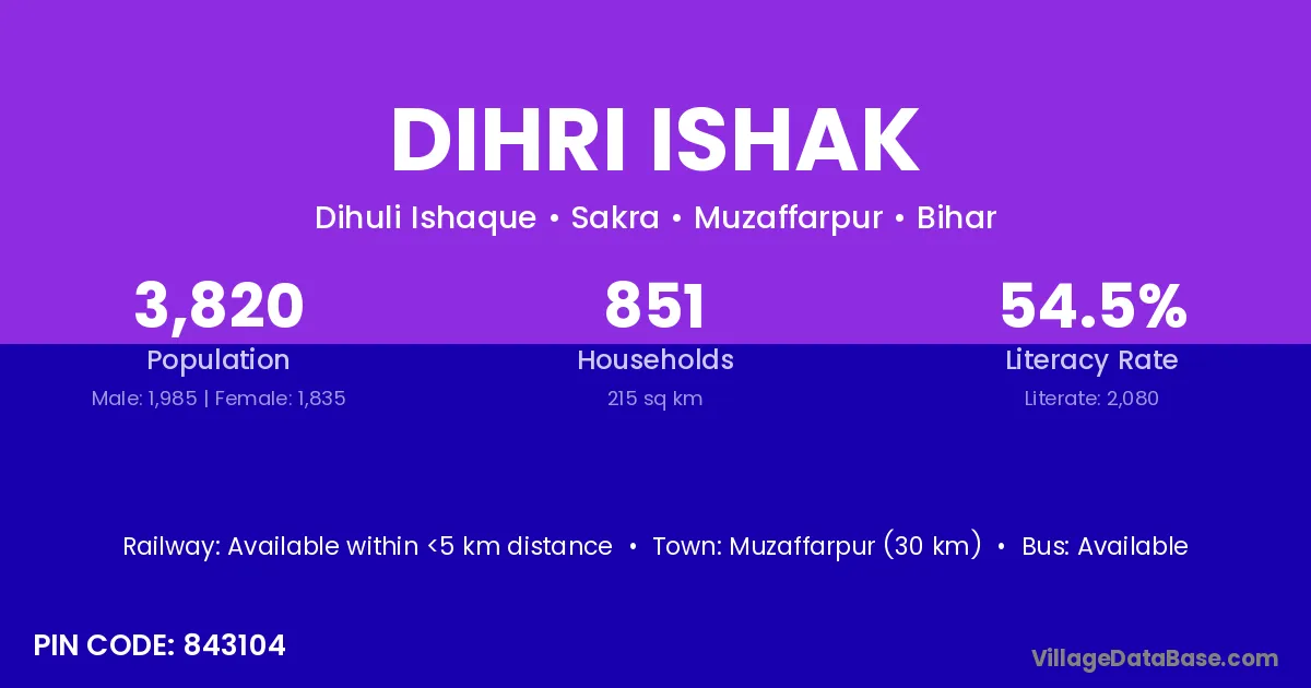 Muzaffarpur (30 km) is the nearest town to Dihri Ishak village for major economic activities and is located approximately 30 km away.