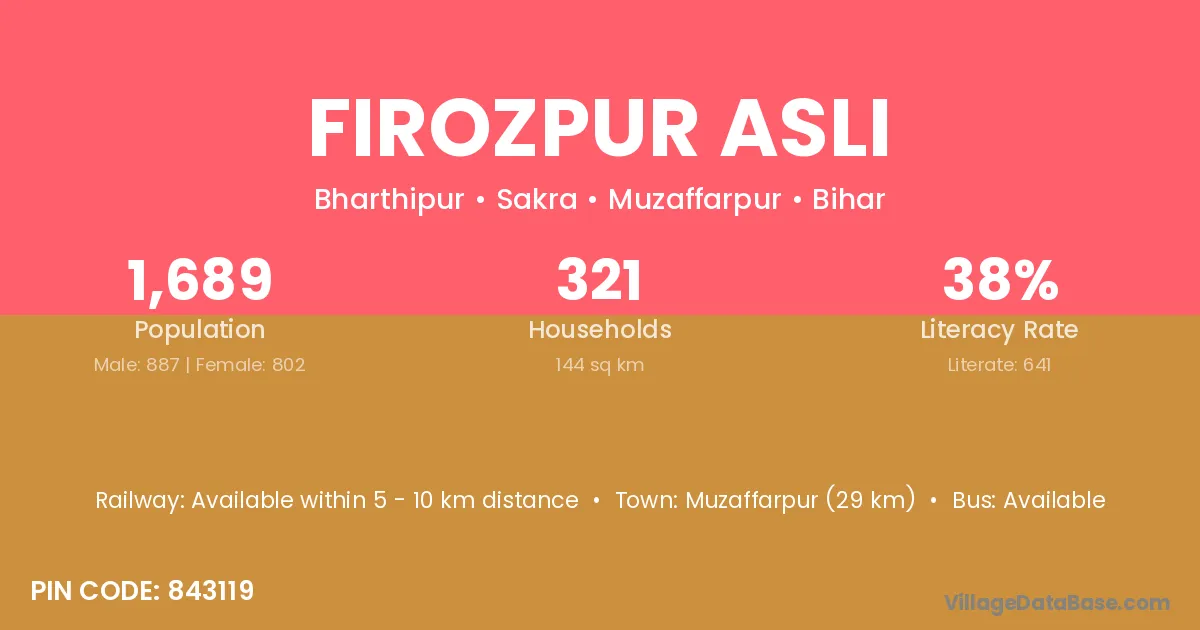 Muzaffarpur (29 km) is the nearest town to Firozpur Asli village for major economic activities and is located approximately 29 km away.