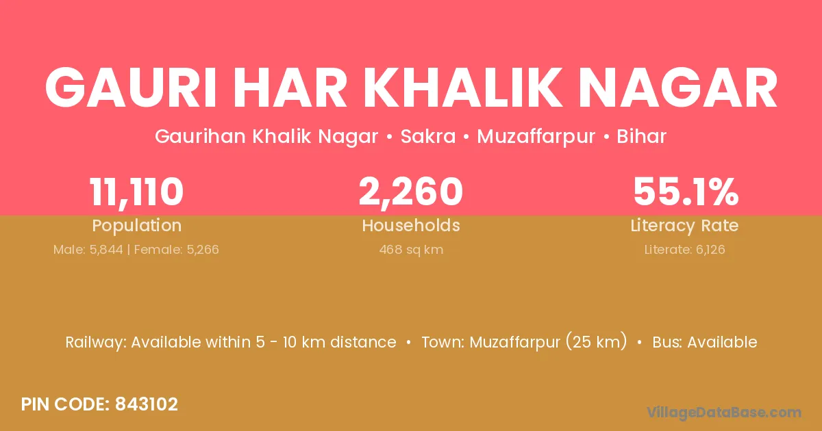 Gauri Har Khalik Nagar village has a total population of 11,110 people, of which 5,844 are males and 5,266 are females.