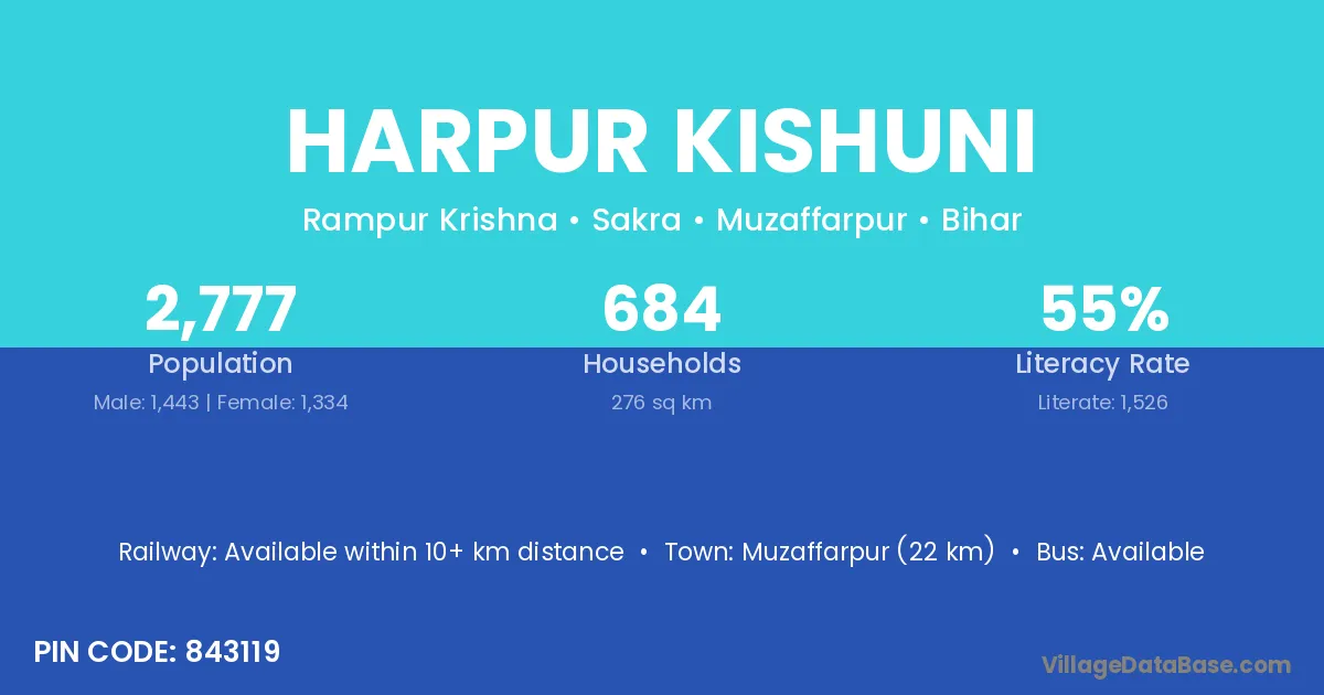 Muzaffarpur (22 km) is the nearest town to Harpur Kishuni village for major economic activities and is located approximately 22 km away.