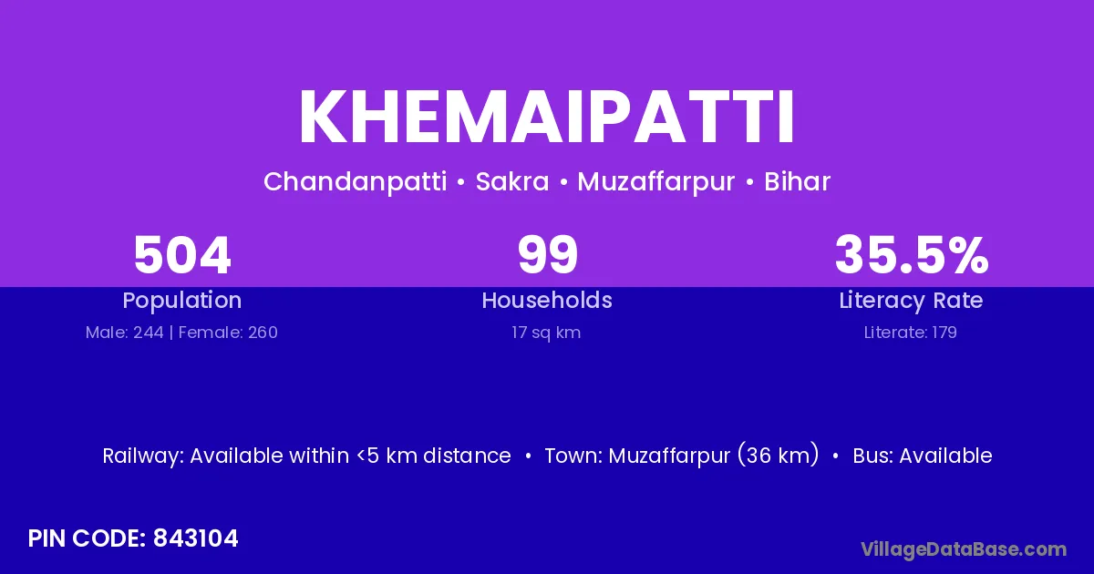 Muzaffarpur (36 km) is the nearest town to Khemaipatti village for major economic activities and is located approximately 36 km away.