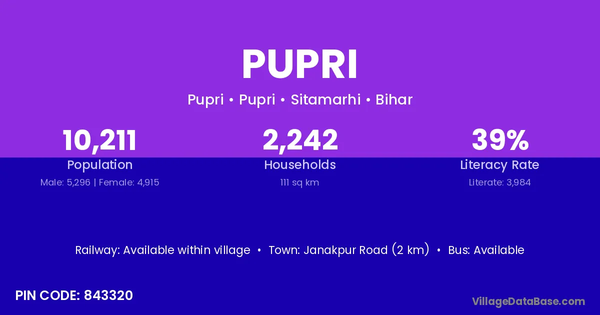 According to Census 2011 information, the village code of Pupri village is 843104.