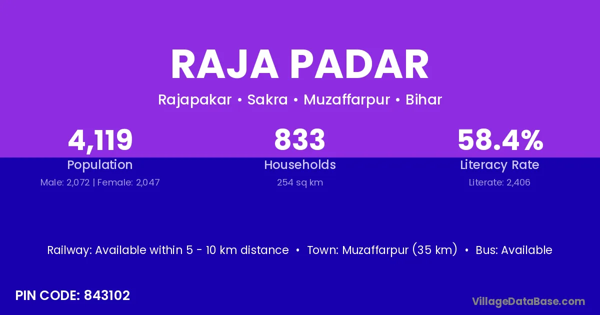 Muzaffarpur (35 km) is the nearest town to Raja Padar village for major economic activities and is located approximately 35 km away.