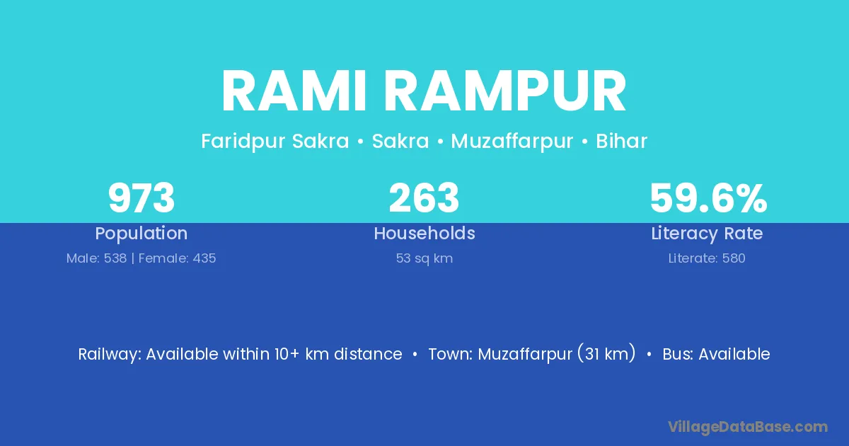 Muzaffarpur (31 km) is the nearest town to Rami Rampur village for major economic activities and is located approximately 31 km away.
