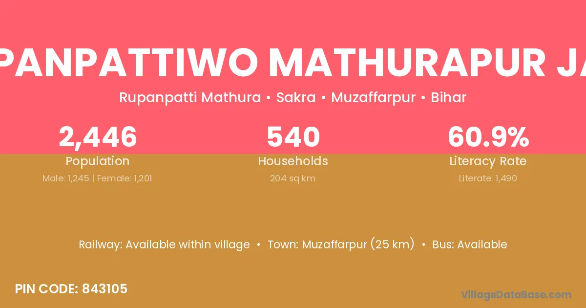 Rupanpattiwo Mathurapur Jani village has a total population of 2,446 people, of which 1,245 are males and 1,201 are females.