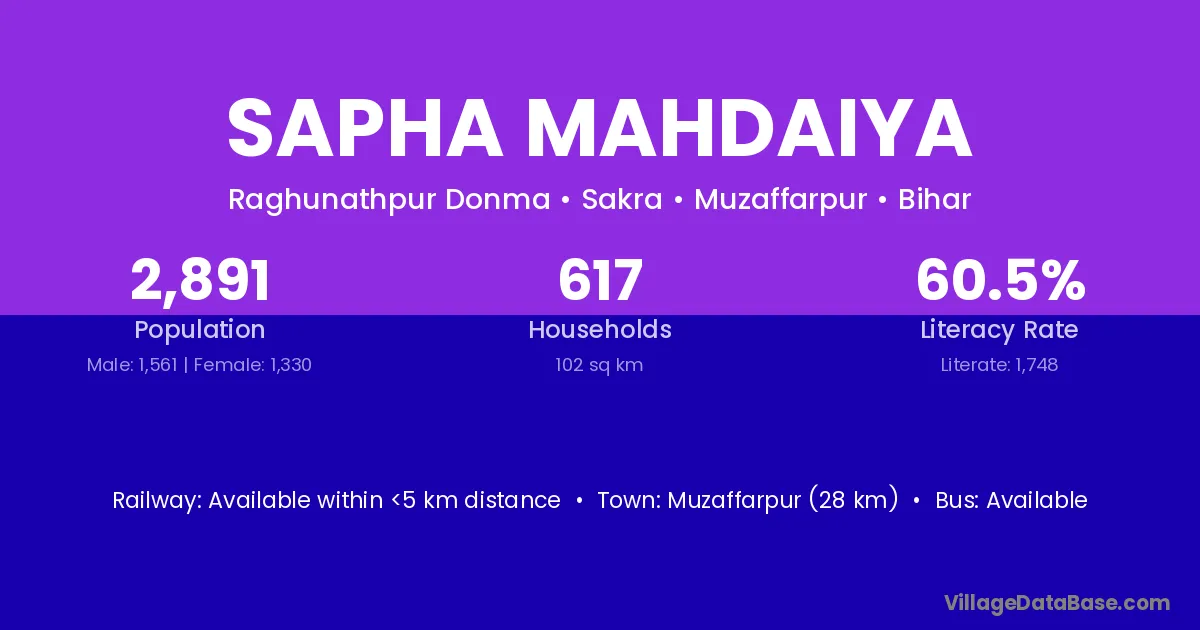 Muzaffarpur (28 km) is the nearest town to Sapha Mahdaiya village for major economic activities and is located approximately 28 km away.