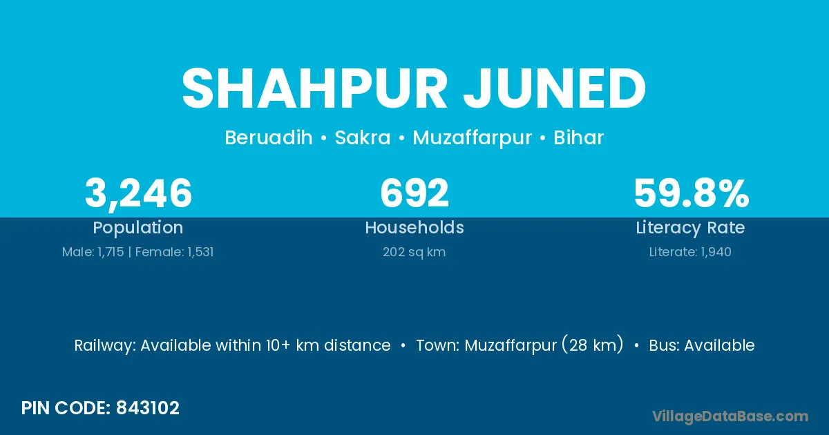 Muzaffarpur (28 km) is the nearest town to Shahpur Juned village for major economic activities and is located approximately 28 km away.