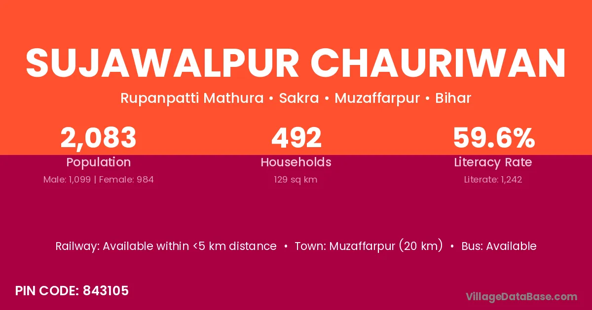 Muzaffarpur (20 km) is the nearest town to Sujawalpur Chauriwan village for major economic activities and is located approximately 20 km away.