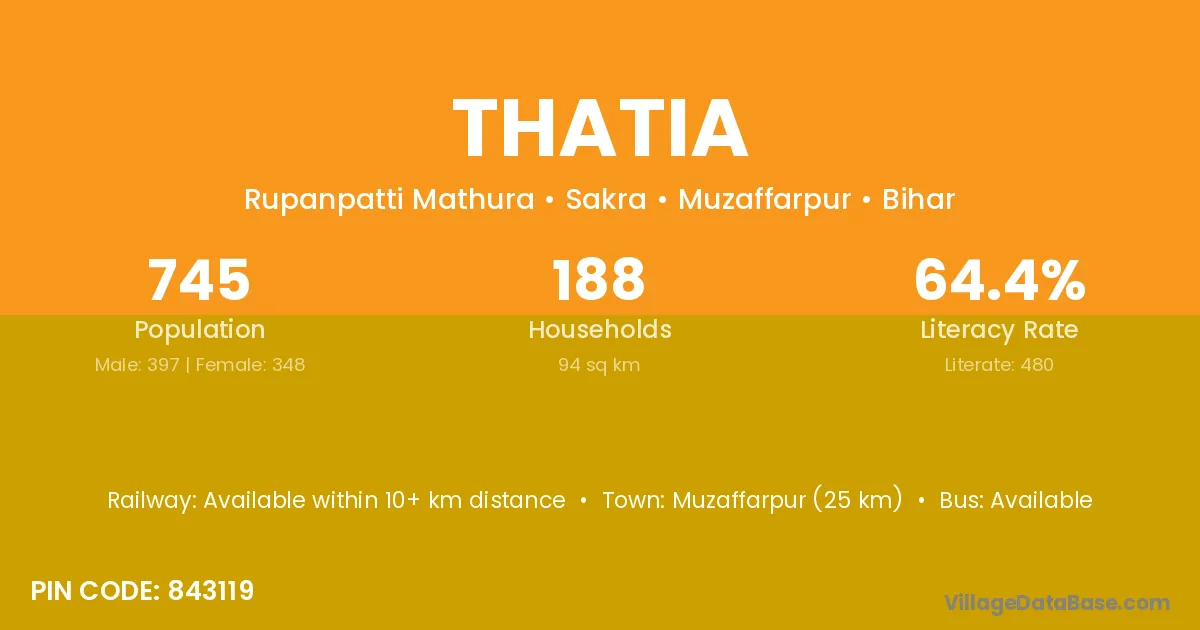 Muzaffarpur (25 km) is the nearest town to Thatia village for major economic activities and is located approximately 25 km away.