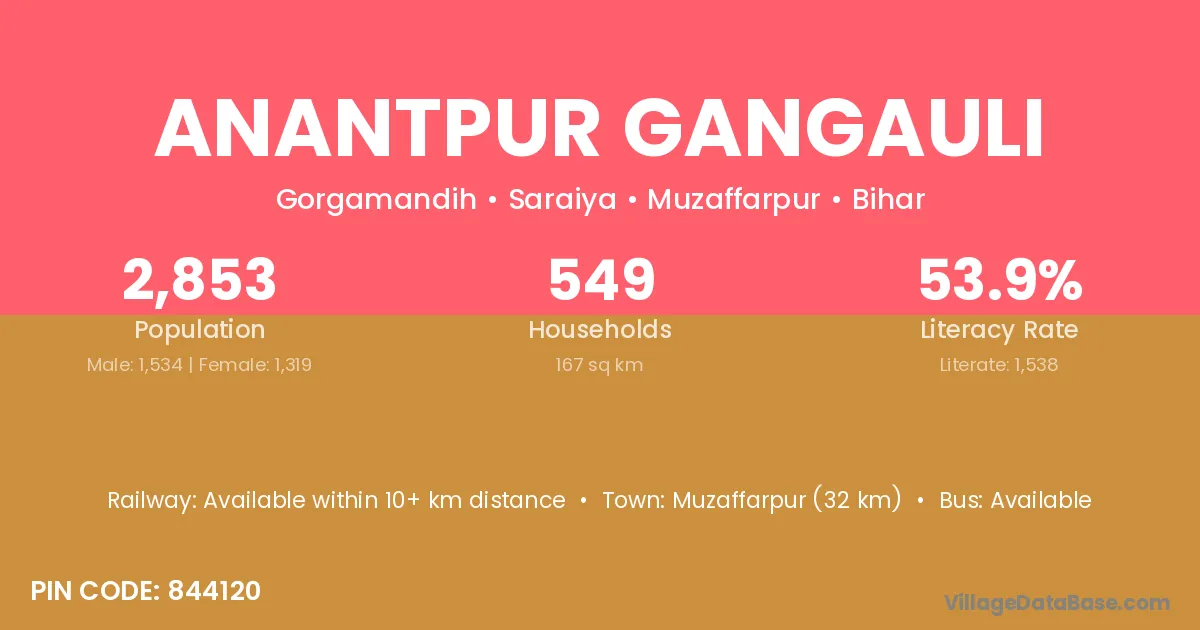 Muzaffarpur (32 km) is the nearest town to Anantpur Gangauli village for major economic activities and is located approximately 32 km away.