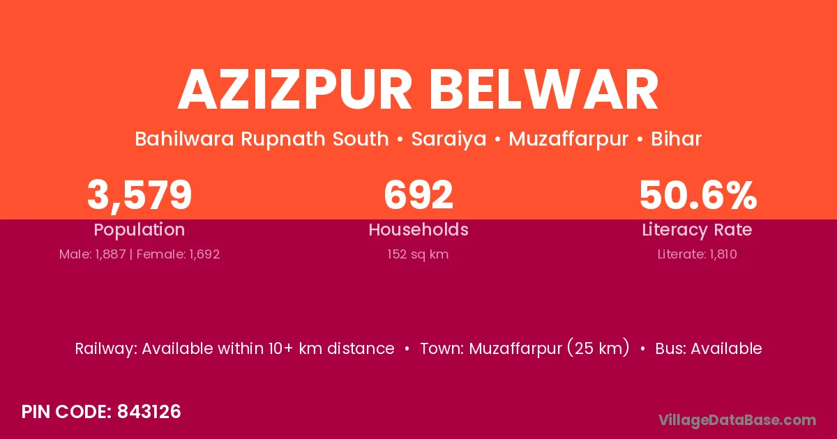 Muzaffarpur (25 km) is the nearest town to Azizpur Belwar village for major economic activities and is located approximately 25 km away.