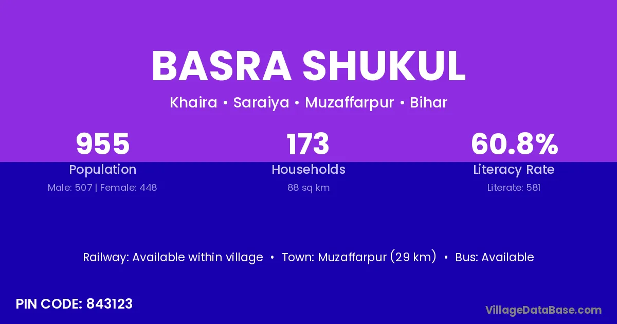 Basra Shukul village has a total population of 955 people, of which 507 are males and 448 are females.
