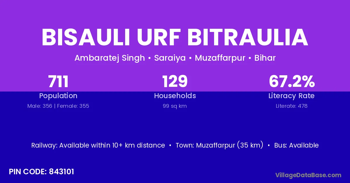 Bisauli Urf Bitraulia village has a total population of 711 people, of which 356 are males and 355 are females.