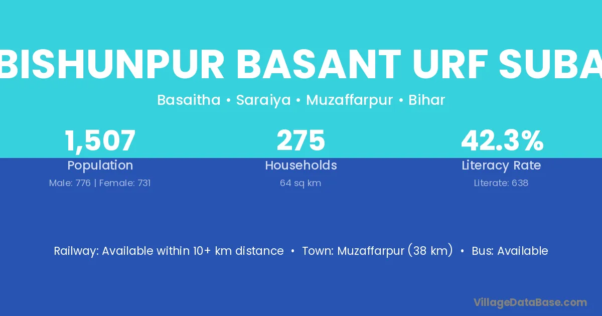 Bishunpur Basant Urf Suba village has a total population of 1,507 people, of which 776 are males and 731 are females.