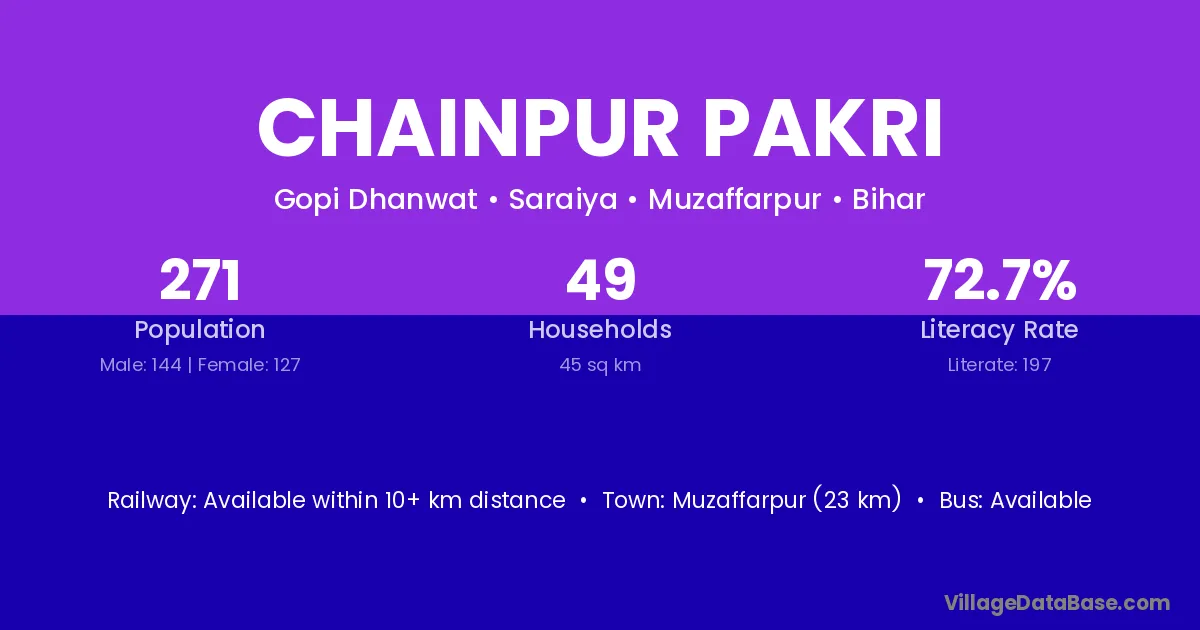 Muzaffarpur (23 km) is the nearest town to Chainpur Pakri village for major economic activities and is located approximately 23 km away.