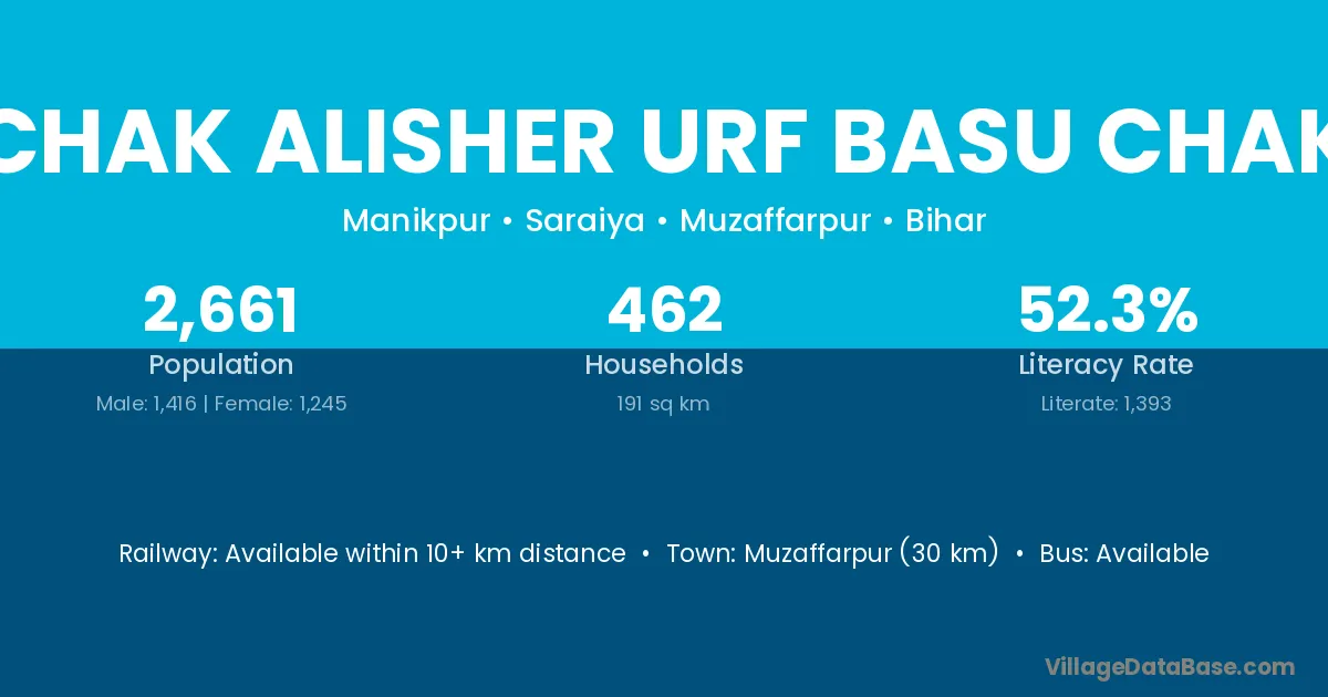 Muzaffarpur (30 km) is the nearest town to Chak Alisher Urf Basu Chak village for major economic activities and is located approximately 30 km away.