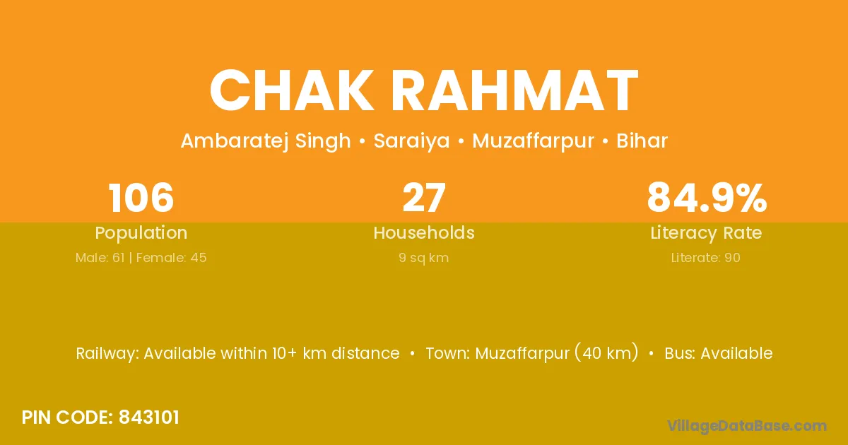 Muzaffarpur (40 km) is the nearest town to Chak Rahmat village for major economic activities and is located approximately 40 km away.