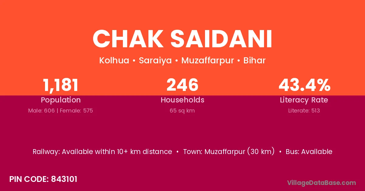 Muzaffarpur (30 km) is the nearest town to Chak Saidani village for major economic activities and is located approximately 30 km away.