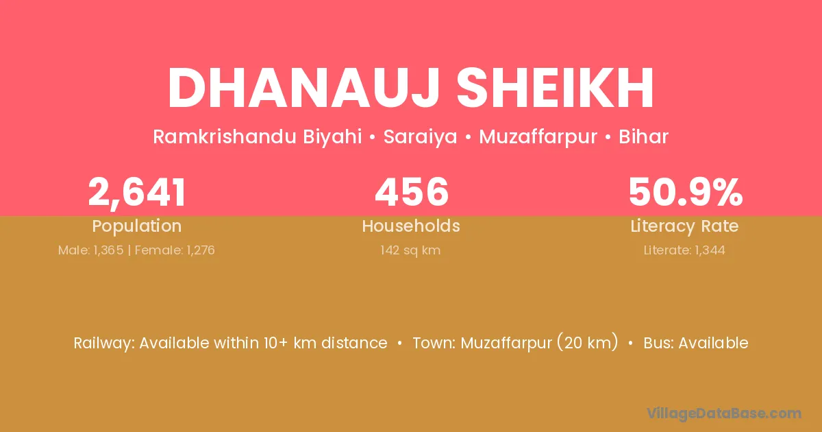 Muzaffarpur (20 km) is the nearest town to Dhanauj Sheikh village for major economic activities and is located approximately 20 km away.