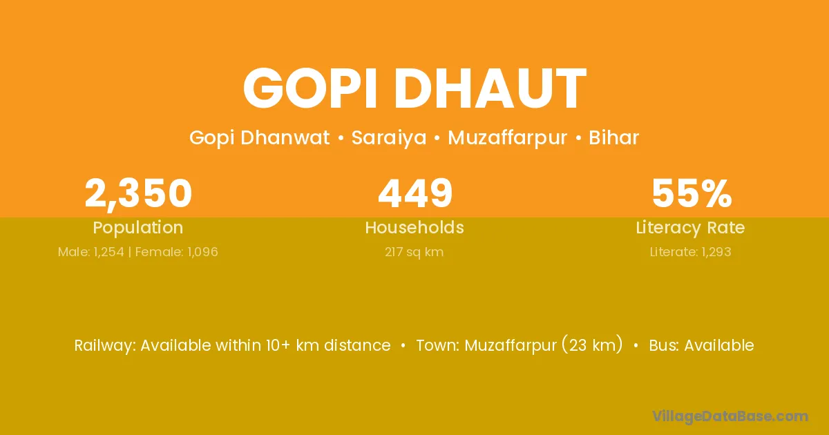 Muzaffarpur (23 km) is the nearest town to Gopi Dhaut village for major economic activities and is located approximately 23 km away.