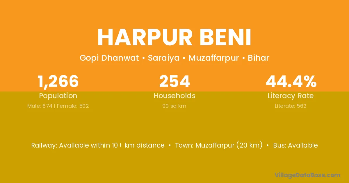 Muzaffarpur (20 km) is the nearest town to Harpur Beni village for major economic activities and is located approximately 20 km away.