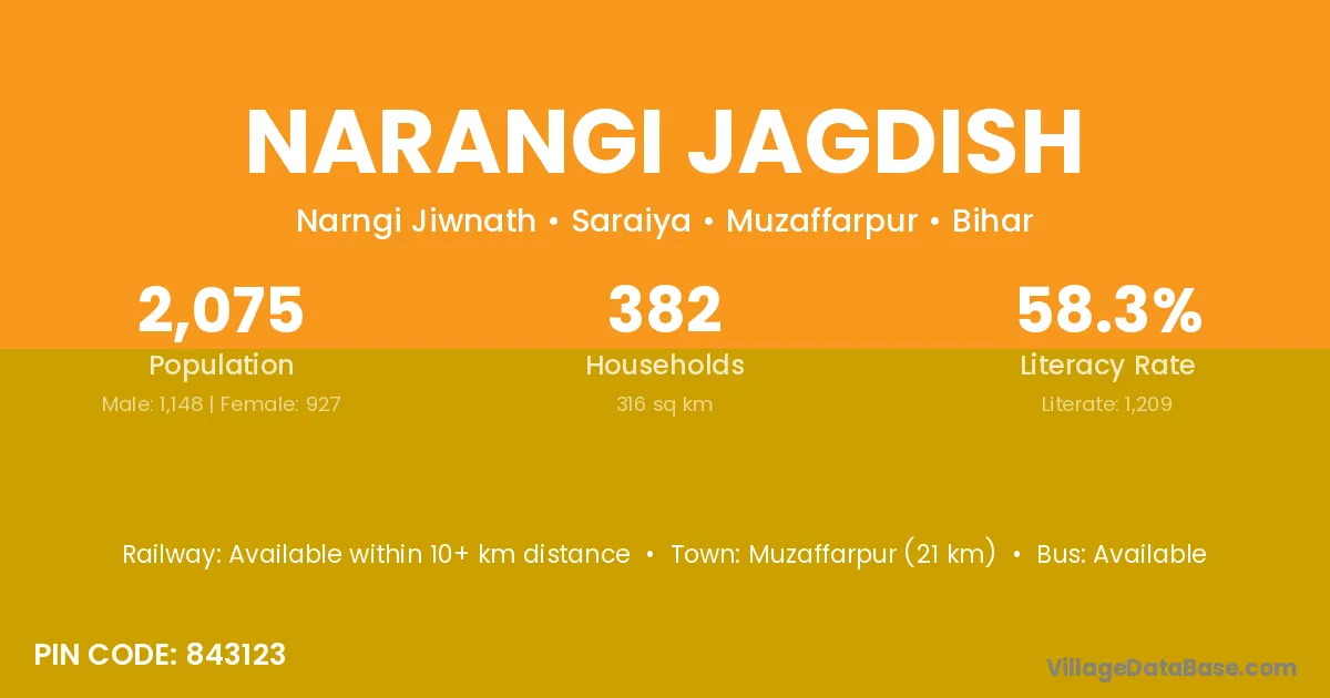 Muzaffarpur (21 km) is the nearest town to Narangi Jagdish village for major economic activities and is located approximately 21 km away.