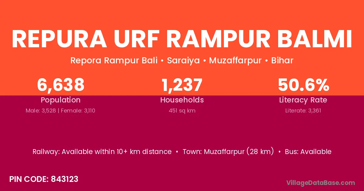 Repura Urf Rampur Balmi village has a total population of 6,638 people, of which 3,528 are males and 3,110 are females.