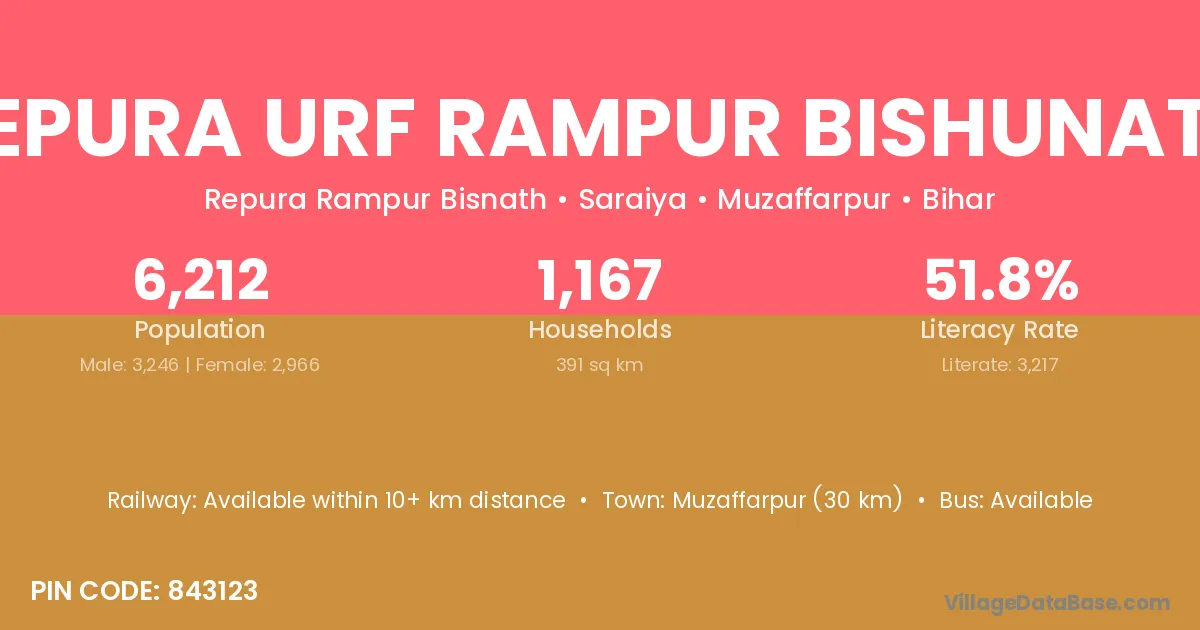 Repura Urf Rampur Bishunath village has a total population of 6,212 people, of which 3,246 are males and 2,966 are females.