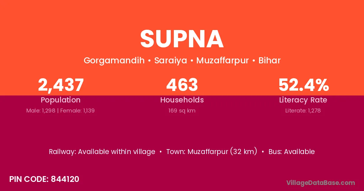Muzaffarpur (32 km) is the nearest town to Supna village for major economic activities and is located approximately 32 km away.