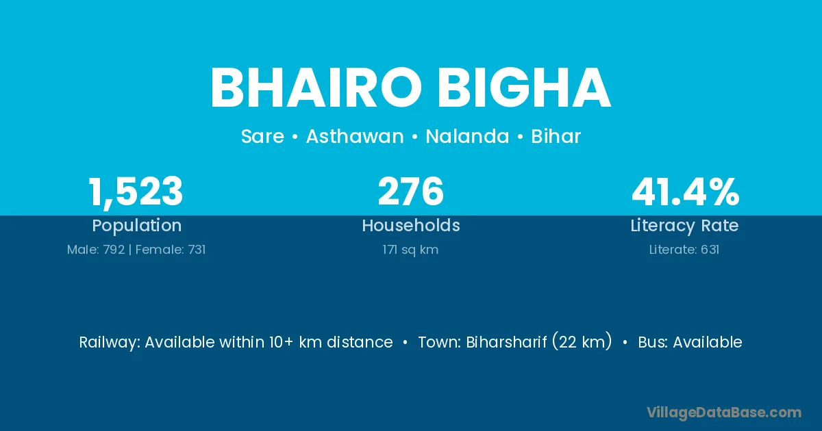 Bhairo Bigha village has a total population of 1,523 people, of which 792 are males and 731 are females.