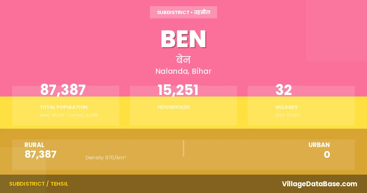 Ben is a town and Subdivision in the Nalanda district of the Bihar. In India, a Subdivision is a subdivision of a district responsible for the administration and revenue collection of a specific area within the district. Subdivisions play a crucial role in the local governance structure, contributing significantly to the development and administration of their communities.