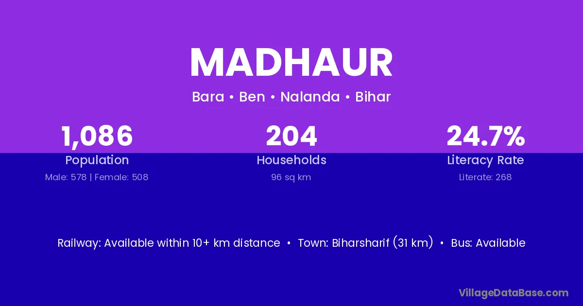 Biharsharif (31 km) is the nearest town to Madhaur village for major economic activities and is located approximately 31 km away.