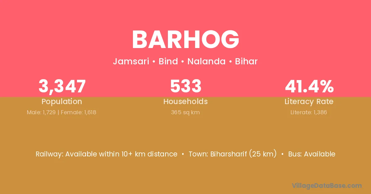 Biharsharif (25 km) is the nearest town to Barhog village for major economic activities and is located approximately 25 km away.