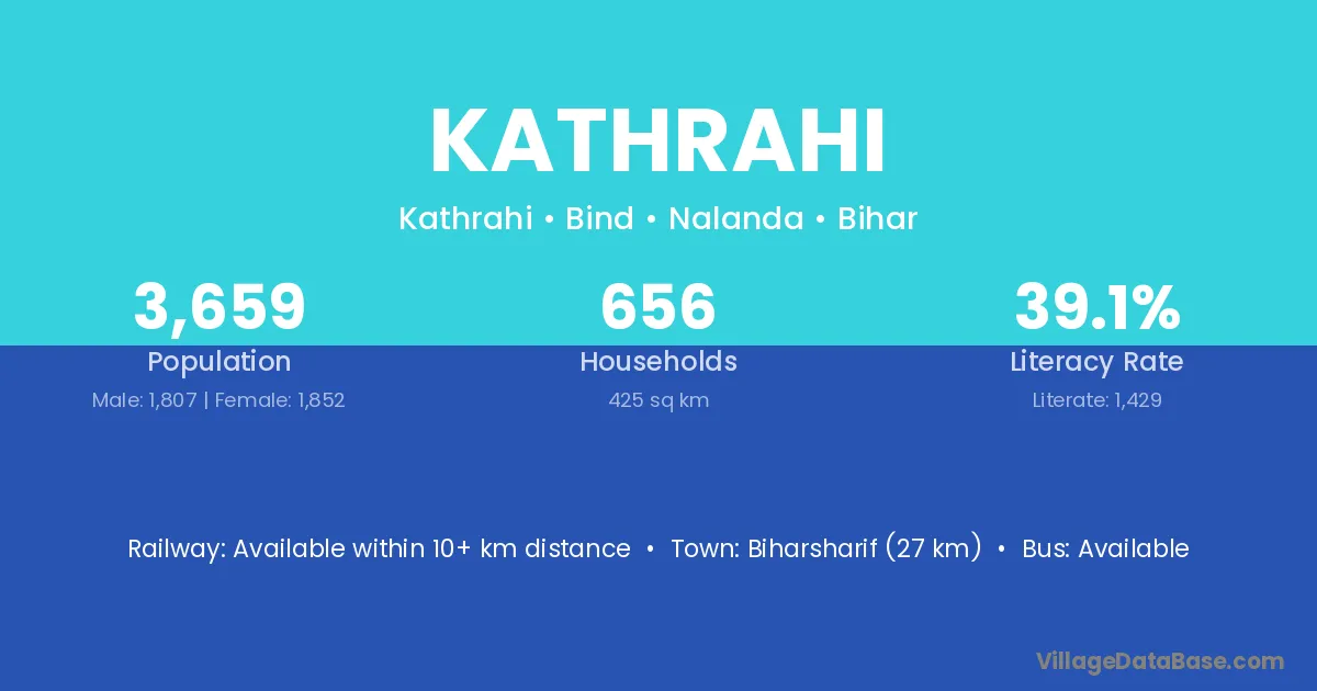 Biharsharif (27 km) is the nearest town to Kathrahi village for major economic activities and is located approximately 27 km away.