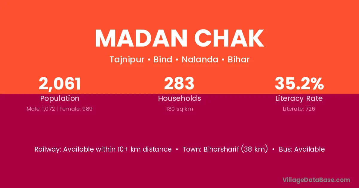 Biharsharif (38 km) is the nearest town to Madan Chak village for major economic activities and is located approximately 38 km away.