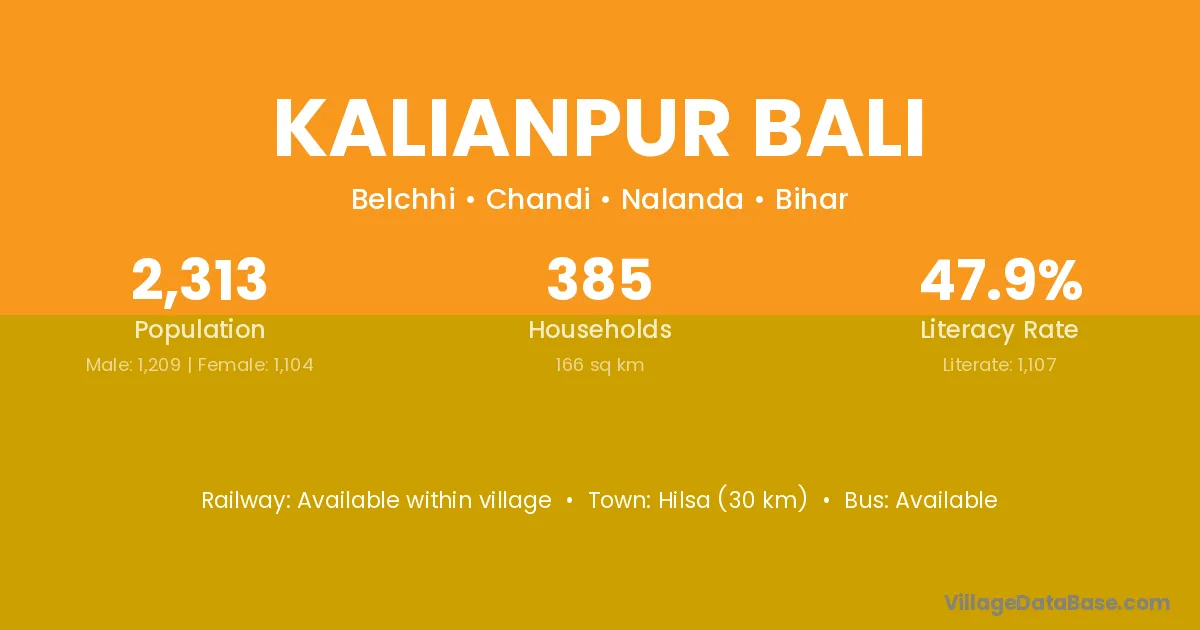 Hilsa (30 km) is the nearest town to Kalianpur Bali village for major economic activities and is located approximately 30 km away.