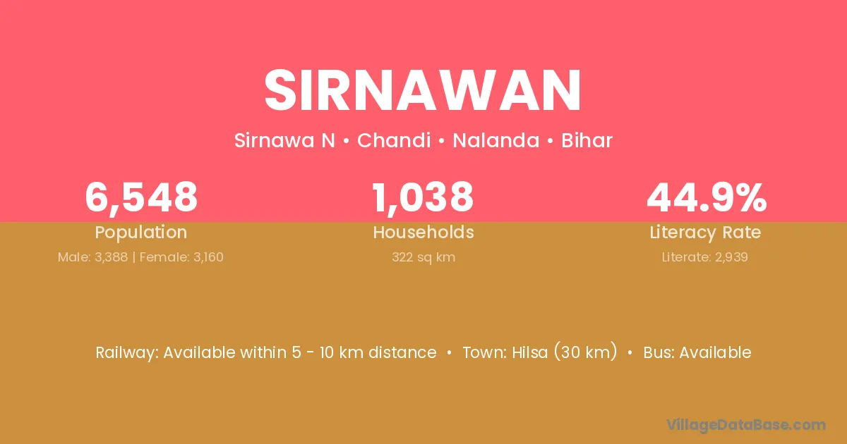 Hilsa (30 km) is the nearest town to Sirnawan village for major economic activities and is located approximately 30 km away.