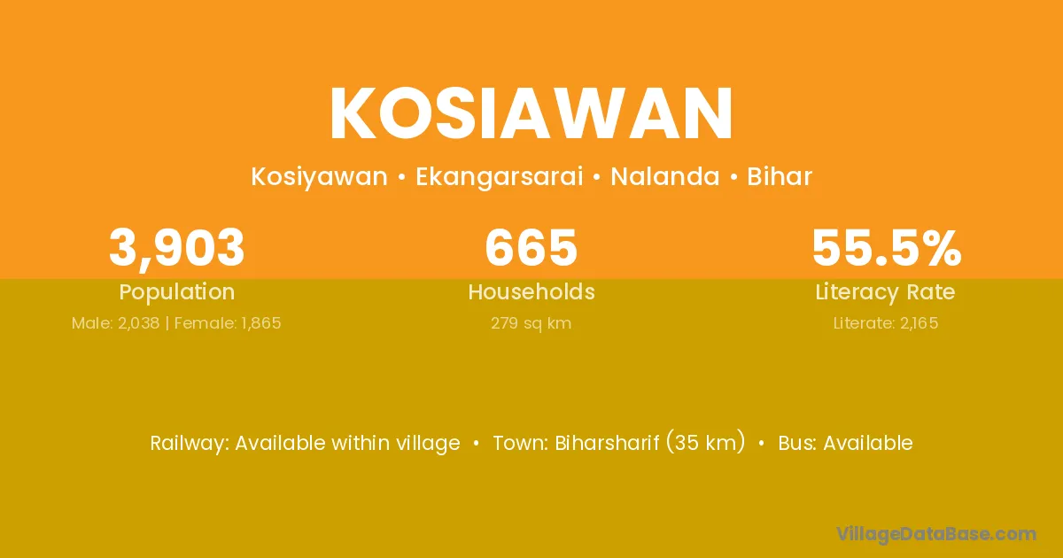 Biharsharif (35 km) is the nearest town to Kosiawan village for major economic activities and is located approximately 35 km away.